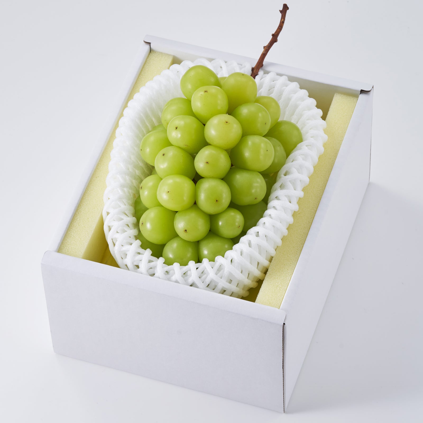 シャインマスカットの人気の秘密は、上品な香りと食べた時のパリッとした歯切れの良い食感、みずみずしい爽やかな甘さが口いっぱいに広がります。また、房は全体に黄緑色で粒はハリがあリ、見栄えのする美しい葡萄です。